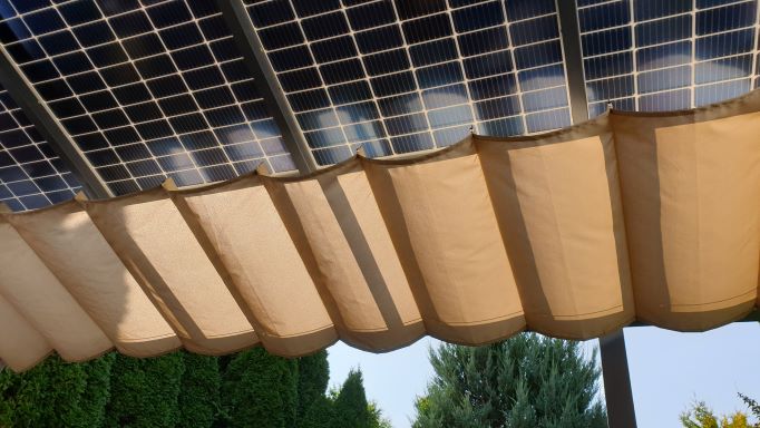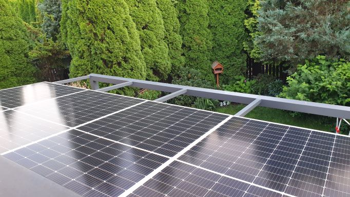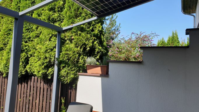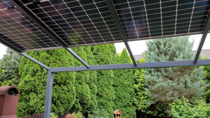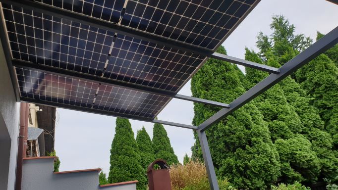 Proponujemy nowocześnie wyglądające zadaszenie tarasu wykonane z elementów stalowych, malowanych proszkowo, pokryte 4 panelami słonecznymi bi-facial.
