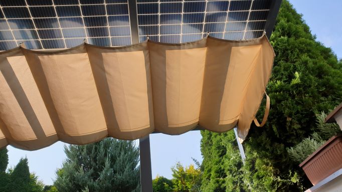 Ochrona pozostałej części tarasu przed deszczem i słońcem spełniona jest przy pomocy rolety rzymskiej (polski produkt, 4 kolory do wyboru: beżowy, szary, biały, zielony) zaciąganej na linkach stalowych w zależności od sytuacji pogodowej.